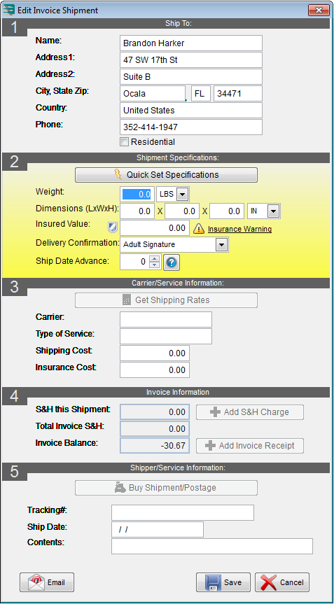 When you are ready to create a shipment for an invoice simply edit the invoice, go to the Shipping tab and click the Add button. The shipment form pops up and looks like this: