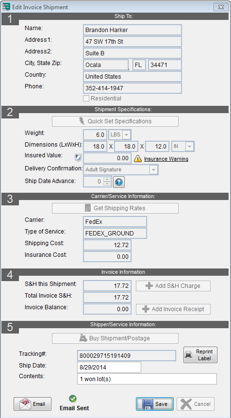 Now we click Add Invoice Receipt to collect payment from the bidder for the shipping & handling. Once the invoice is paid in full we can then proceed to step 5, purchasing the shipping.